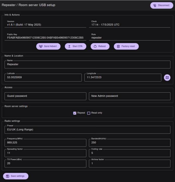 Wenn der Standort eines Repeaters festgelegt ist, kann dieser auf einer MeshCore-Karte eingetragen und angezeigt werden. Lege den Standort mit den folgenden Befehlen fest: